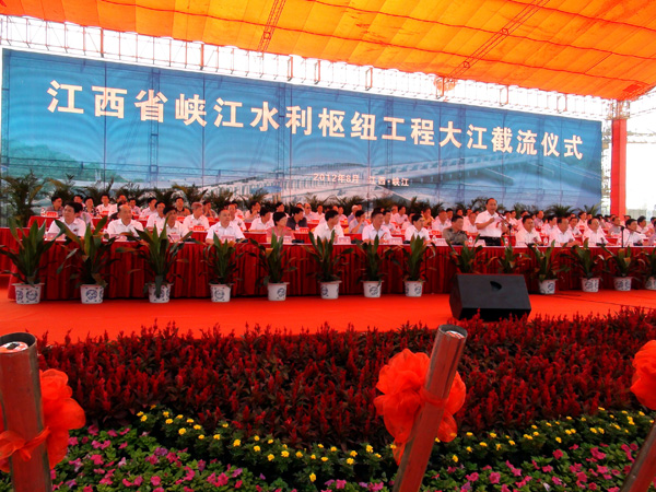 截流儀式由省委常委、常務(wù)副省長(zhǎng)凌成興主持。10時(shí)16分,省長(zhǎng)鹿心社宣布大江截流開(kāi)始,10時(shí)29分,隨著最后一車石料投入江中,三期圍堰成功合龍后,省委書(shū)記蘇榮鄭重宣布:“峽江水利樞紐工程大江截流成功”。