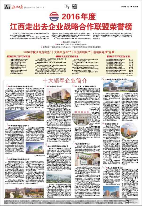 6月3日,江西走出去企業(yè)戰(zhàn)略合作聯(lián)盟2017年大會在南昌召開。省委常委、常務副省長毛偉明出席大會并作重要講話,會上省委常委、常務副省長毛偉明、省政府秘書長王亞聯(lián)和省商務廳廳長王水平分別為2016年度全省走出去“十大領軍企業(yè)”、“十大優(yōu)秀項目”和“十佳項目經理”授牌。江西走出去企業(yè)戰(zhàn)略合作聯(lián)盟輪值主席、中國江西國際經濟技術合作公司總經理徐國建報告了2016年工作,國家開發(fā)銀行江西分行、中國進出口銀行江西省分行和中國出口信用保險公司南昌營管部作為聯(lián)盟副主席單位發(fā)言。公司董事長王元旦作為十大優(yōu)秀項目的企業(yè)代表發(fā)言?!督魅請蟆?、《江西衛(wèi)視》相繼對大會進行了大幅報道。