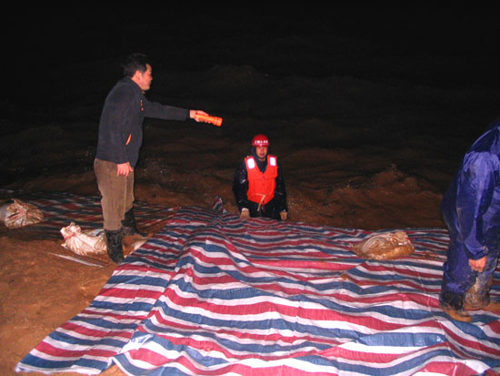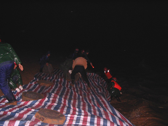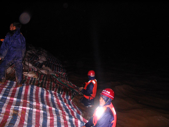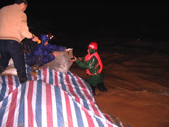 根據(jù)以往的施工經(jīng)驗,我們很快啟動了搶險應(yīng)急預(yù)案。但由于環(huán)境惡劣,考驗我們的時候到了,要發(fā)揚我們江西水建人“特別能吃苦、特別能戰(zhàn)斗、特別能忍耐、特別能協(xié)作精神”的時候到了,我們與洪水搶時間、爭進(jìn)度,全體干群在漆黑的大堤上是一片穿梭奔跑的身影,大家齊心協(xié)力,手提肩扛,把一百多斤一塊的混凝土預(yù)制塊,一塊塊運到堤腳,此時項目部總工曾俊平不顧江水的寒冷,帶領(lǐng)其它幾名員工,奮身躍入水中,在水下鋪設(shè)彩條布,而此時水下溫度只有10℃左右,渾濁江水一浪高過一浪拍打在他們的身上。大家顧不上寒冷,顧不上疲勞,顧不上饑餓,衣服濕了又干,干了又濕,分不清是哪次被汗水還是雨水弄濕的,在微弱的手電光照亮下鋪設(shè)了一條又一條彩布條,碼起了一道又一道沙包小堤。經(jīng)過大家的緊張奮戰(zhàn),終于幾處險情得到了控制,等到我們在忙碌中回過神來時,已經(jīng)是次日的凌晨三點多鐘,盡管大家拖著一副疲憊不堪的泥身子,但大家臉上裝滿了滿意和勝利的微笑,王總此時飽含真情地對大家說了一聲:“大家真的辛苦了,謝謝大家!”走在回家的路上,我正好與項目總工曾俊平走在一起,我看到他渾身濕漉漉的,我關(guān)心的問他在水中冷嗎?他笑笑說道:“這是關(guān)鍵時刻,再冷也要下”。他旁邊的同事告訴我,他是從下午三點鐘就一直在水里做事直到剛才,整整在水中浸泡了十二個小時。我們參加搶險的同志被曾俊平這種不怕困難、不畏艱險、不顧個人安危、敢于吃苦的精神深深感動著,真是我們學(xué)習(xí)的好榜樣!