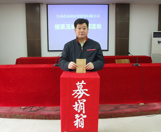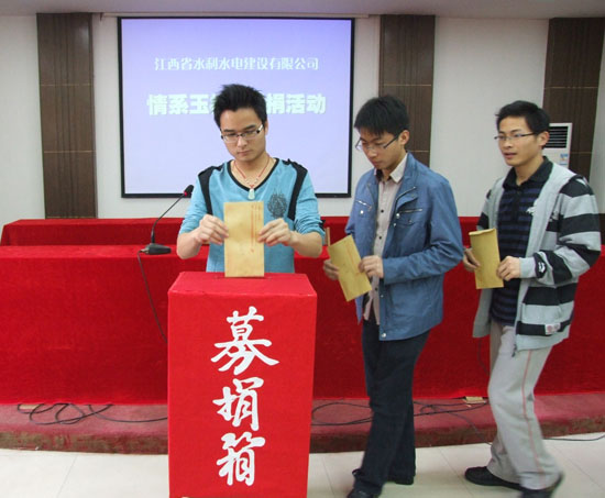 2010年4月14日,青海省玉樹縣發(fā)生兩次地震,最高震級(jí)7.1級(jí),造成了當(dāng)?shù)鼐薮蟮娜松韨龊拓?cái)產(chǎn)損失,“玉樹地震”牽動(dòng)著億萬人民的心,也牽動(dòng)著我司所有員工的心!公司在全司范圍內(nèi)積極開展“情系玉樹募捐活動(dòng)”,4月26日,我公司南昌市機(jī)關(guān)總部首先開展了“情系玉樹募捐活動(dòng)”,公司中層以上管理人員和員工踴躍參與募捐活動(dòng),紛紛獻(xiàn)上自己的一份愛心,體現(xiàn)出江西水總?cè)说纳鐣?huì)責(zé)任感!同時(shí),各分公司、國內(nèi)外施工項(xiàng)目部也在開展此項(xiàng)活動(dòng),預(yù)計(jì)此項(xiàng)活動(dòng)將募得資金3萬余元。