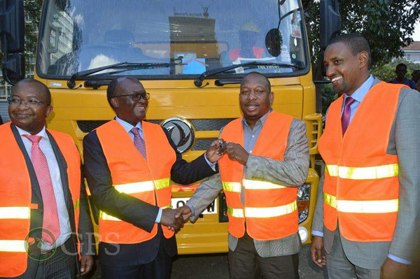 總督Mike Sonko及內(nèi)羅畢交通局部長(zhǎng)James Wainaina Macharia在清污車前合影(左2為部長(zhǎng)James,右2為總督Mike Sonka)