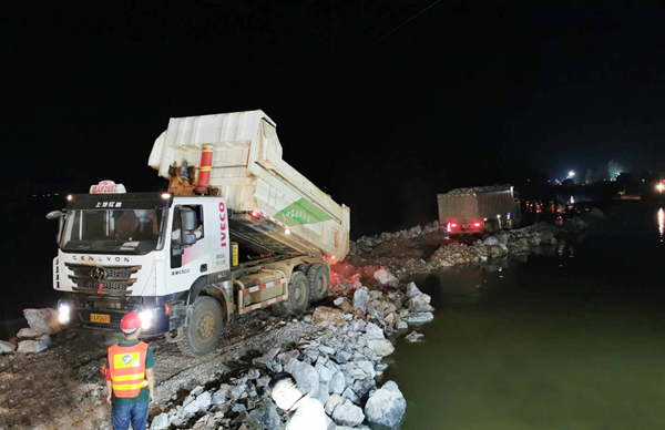 7月13日下午,公司完成封堵工作技術(shù)測量和封堵工作技術(shù)方案制定,7月13日晚上,搶險技術(shù)、施工人員及設(shè)備陸續(xù)進(jìn)場,并調(diào)配塊石、砂礫石等各類材料進(jìn)場。決口封堵采取南北兩岸同時進(jìn)占方式施工, 7月14日中午14時開始進(jìn)占施工,經(jīng)過兩天兩夜連續(xù)55個小時施工作業(yè),于7月16日晚上21時43分,完成決口合攏,比預(yù)計完工時間提前50小時。