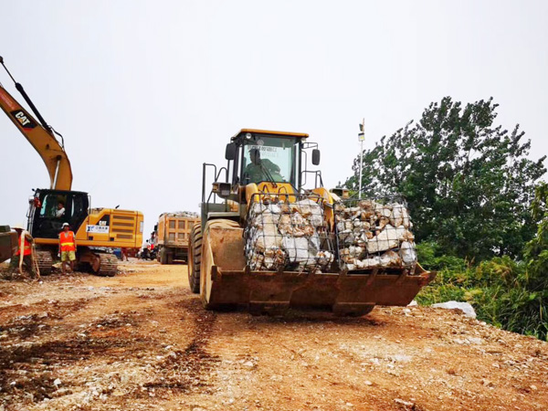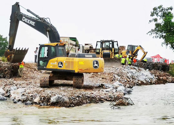 7月14日14時,封堵作業(yè)正式啟動,南北兩岸同時進(jìn)占施工。然而,困難層出不窮:道路不平,存在積水,影響車輛通行;一線搶險(xiǎn)人員的生活保障還不夠完善,吃住條件艱苦,防雨防曬防蚊設(shè)施簡陋,無便攜照明設(shè)施;砂石骨料耗量巨大,但存在配額限制,獲取來源較少。但現(xiàn)場人員攻堅(jiān)克難,積極與政府、當(dāng)?shù)丶捌h(yuǎn)廠商溝通,解決了人員基本需求和石料問題,并在當(dāng)日順利鋪石20米,邁上堅(jiān)實(shí)的第一步。
