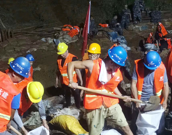 7月13日下午,公司完成封堵工作技術(shù)測量和封堵工作技術(shù)方案的制定工作。7月13日晚上,搶險(xiǎn)技術(shù)、施工人員及施工機(jī)械設(shè)備陸續(xù)進(jìn)場,并調(diào)配塊石、砂礫石等各類材料進(jìn)場。決口封堵采取南北兩岸同時(shí)進(jìn)占方式施工, 7月14日中午14時(shí)開始進(jìn)占施工,經(jīng)過兩天兩夜連續(xù)55個(gè)小時(shí)施工作業(yè),于7月16日晚上21時(shí)43分,完成決口合攏,比預(yù)計(jì)完工時(shí)間提前50小時(shí)。