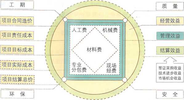 “方圓圖”是具有操作性的工具。其一,“方圓圖” 完整詮釋了建筑項(xiàng)目管理行為間的關(guān)系?!敖禹?xiàng)目”確定了合同造價(jià),對應(yīng)方圓圖的實(shí)線圓;“做項(xiàng)目”的第一步是下達(dá)項(xiàng)目目標(biāo)責(zé)任書,確定項(xiàng)目責(zé)任成本,對應(yīng)方圓圖的責(zé)任成本方形,第二步分子公司在責(zé)任書的基礎(chǔ)上進(jìn)行項(xiàng)目實(shí)施策劃,產(chǎn)生項(xiàng)目的目標(biāo)成本,對應(yīng)方圓圖的目標(biāo)成本方形,第三步就是項(xiàng)目實(shí)施過程的管控,最終確定實(shí)際成本,對應(yīng)方圓圖的實(shí)際成本方形。“算賬收錢”就是完成項(xiàng)目過程中的結(jié)算變更與最后的決算收款,從而確定結(jié)算造價(jià),對應(yīng)方圓圖的結(jié)夢造價(jià)虛線圓。項(xiàng)目實(shí)施過程中進(jìn)度、質(zhì)量、安全、環(huán)保及周邊相關(guān) 方的管理對應(yīng)成本方形的四個支撐頂點(diǎn),構(gòu)成成本的五項(xiàng)費(fèi)用“材料、人工、機(jī)械、現(xiàn)場經(jīng)費(fèi)、專業(yè)分包”對應(yīng)成本方形的內(nèi)部區(qū)域。